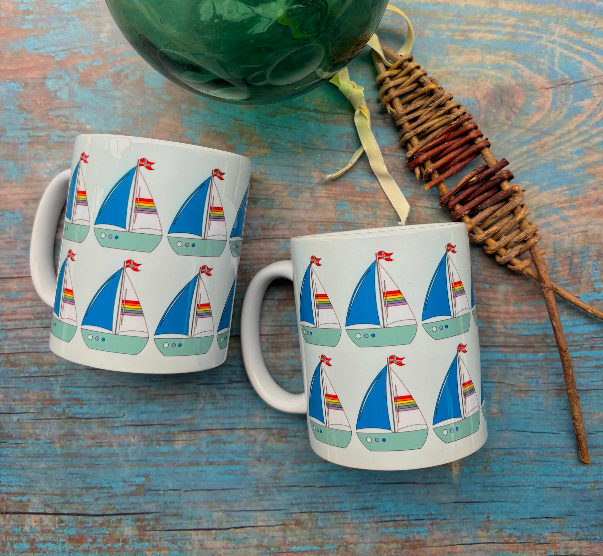 The boats were white in colour with very large sails and the one boat had a rainbow sail 🌈.